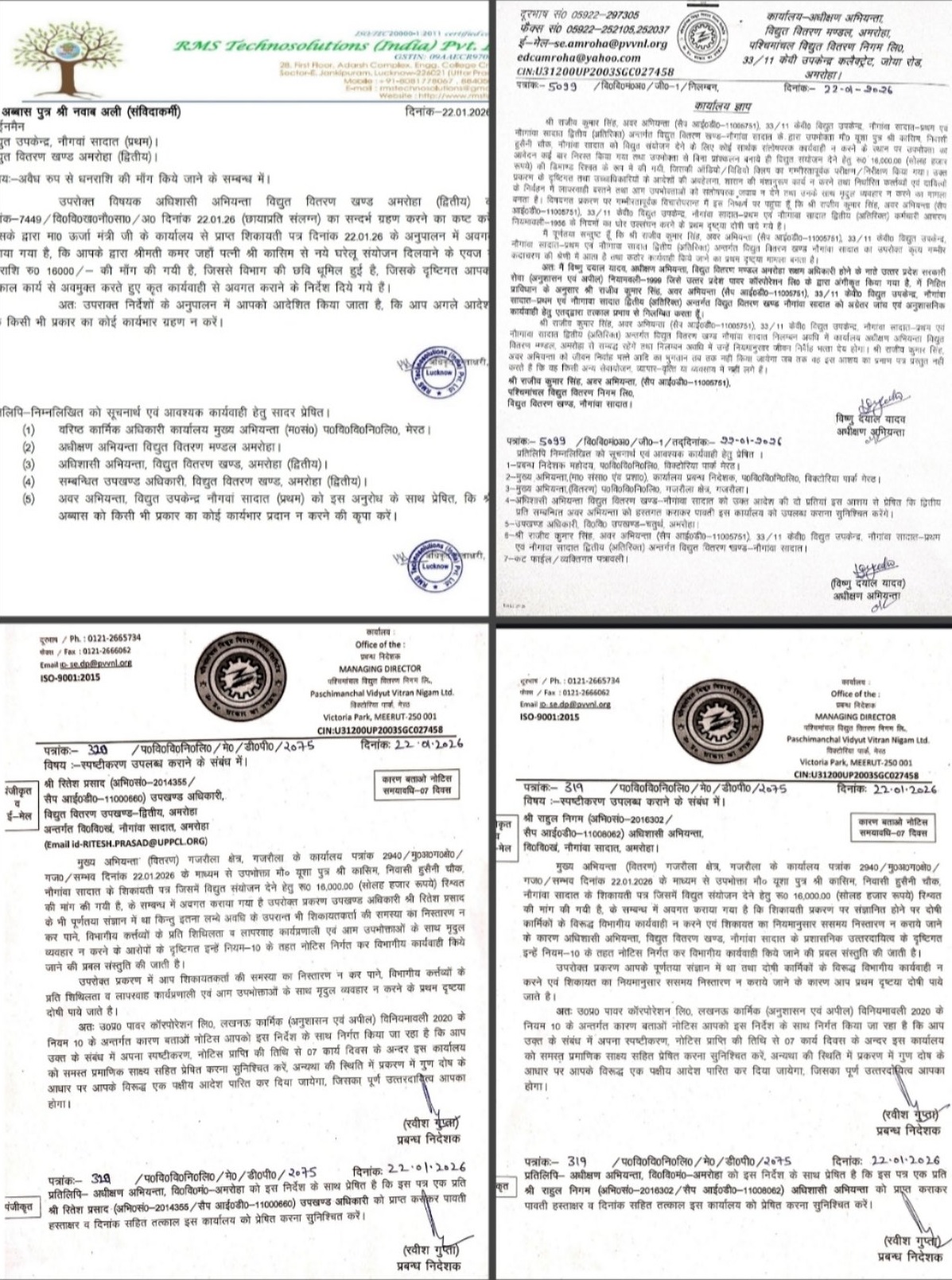 मंत्री जी (AK Sharma) ने कहा कि प्रदेश में घूसखोरी, लापरवाही और जनता को परेशान करने वालों के लिए कोई जगह नहीं है। जनसुनवाई के दौरान अमरोहा जनपद के नौगांव सादात निवासी शिकायतकर्ता मोहम्मद यूसा, पुत्र कासिम ने विद्युत संयोजन देने के नाम पर रिश्वत मांगने तथा जानबूझकर कार्य में टालमटोल किए जाने की शिकायत मंत्री के समक्ष रखी, जिसे मंत्री श्री शर्मा ने अत्यंत गंभीरता से लिया।