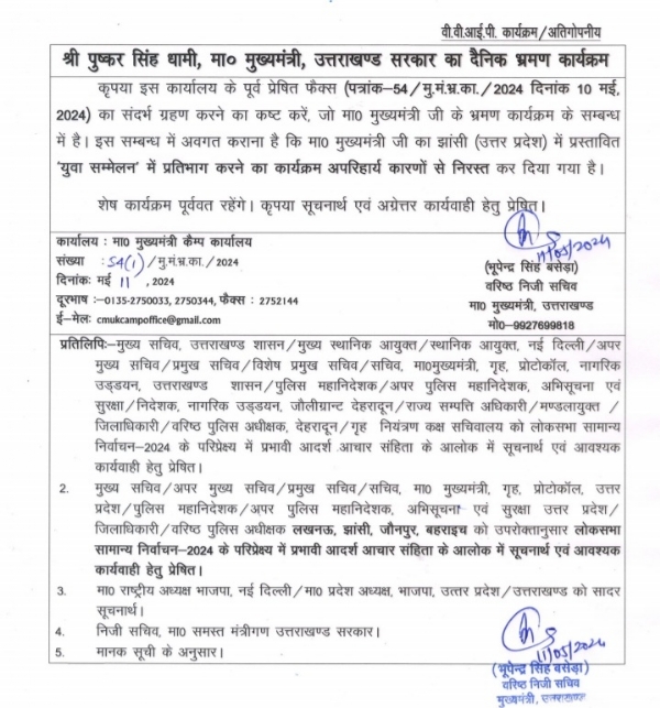 वहीं उत्तराखंड के मुख्यमंत्री पुष्कर धामी (CM Dhami) के निजी सचिव भूपेन्द्र बसेड़ा ने पत्र जारी करते हुए बताया कि अपरिहार्य कारणों के चलते झांसी में आयोजित युवा संवाद कार्यक्रम निरस्त किया गया हैं।